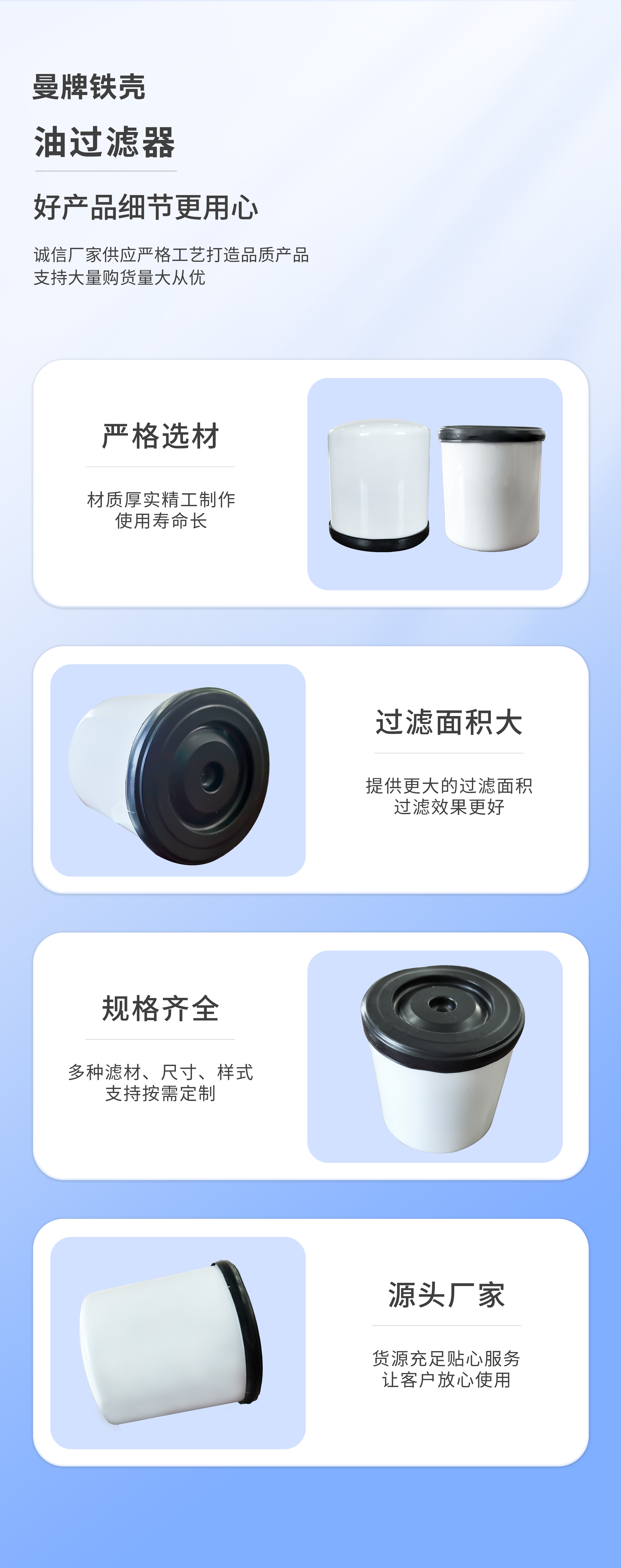 曼牌濾清器廣泛應用在乘用車、商用車、工程機械和工業領域,主要負責清除空氣中的微粒雜質的裝置。其主要作用是濾除將要進入汽缸的空氣中有害雜質,以減少汽缸、活塞、活塞環、氣門及氣門座的早期磨損和氧化。 因為機油在發動機的保護方面承擔著潤滑、冷卻、清潔、防腐和密封等至關重要的作用;而只有清潔的機油才能完成上述工作。所以,機油和機油濾清器的整體性能才是決定機油保護發動機壽命的決定性因素。